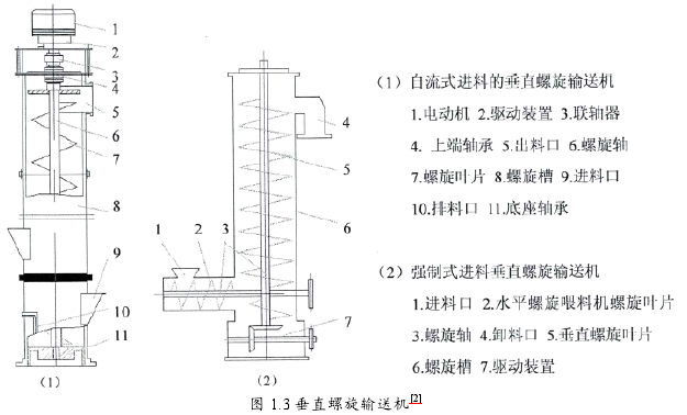 宏源機械公司生產的垂直螺旋輸送機由垂直螺旋主體、下端進料口、料槽、軸承、上端出料口、以及驅動裝置六部分共同組成的垂直螺旋輸送機如圖1.3所示。垂直螺旋輸送機的驅動形式可根據實際情況選用頂部驅動、底部驅動或雙向驅動。垂直螺旋輸送機的正常工作必須保證其對物料顆粒的做功大于物料自重和物料在機殼內的摩擦阻力所作的功。