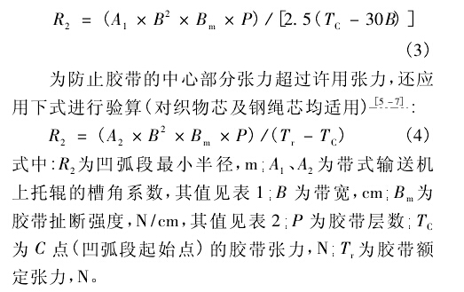 由式1可計算得出凹弧段的最小半徑。但是當(dāng)膠帶的張力過低時,膠帶的邊緣處有可能產(chǎn)生皺曲,將無法保證皮帶輸送機的安全運行,因此需對該半徑值進行必要的校核。鑒于目前國內(nèi)尚無成熟的計算公式可循,建議采用美國輸送設(shè)備制造商協(xié)會聯(lián)合會推薦的公式對最小半徑進行驗算,以保證膠帶具有足夠張力,避免在凹弧段處的膠帶邊緣出現(xiàn)零張力'對織物芯膠帶,用下式進行驗算: