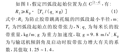 平穩(wěn)運行。實際的設(shè)計計算表明,對于一般的皮帶輸送機凹弧段半徑的計算,式( 1) 的計算結(jié)果可滿足要求。但在某些條件下,式( 2) 、( 3) 的計算結(jié)果也會大于式( 1) 的所得,從而導(dǎo)致半徑過大給工藝布置帶來一定的困難。查式( 2) 、( 3) ,可采取加大拉緊力的方法以增大Tc值,使其計算結(jié)果得到減小。下面將討論凹弧段起始點張力Tc的計算方法。